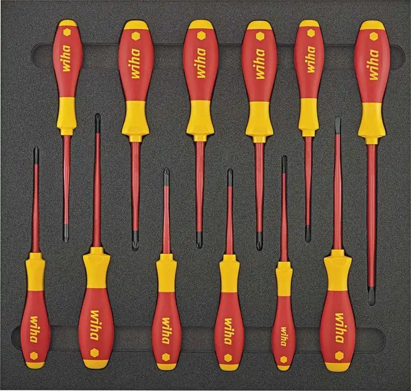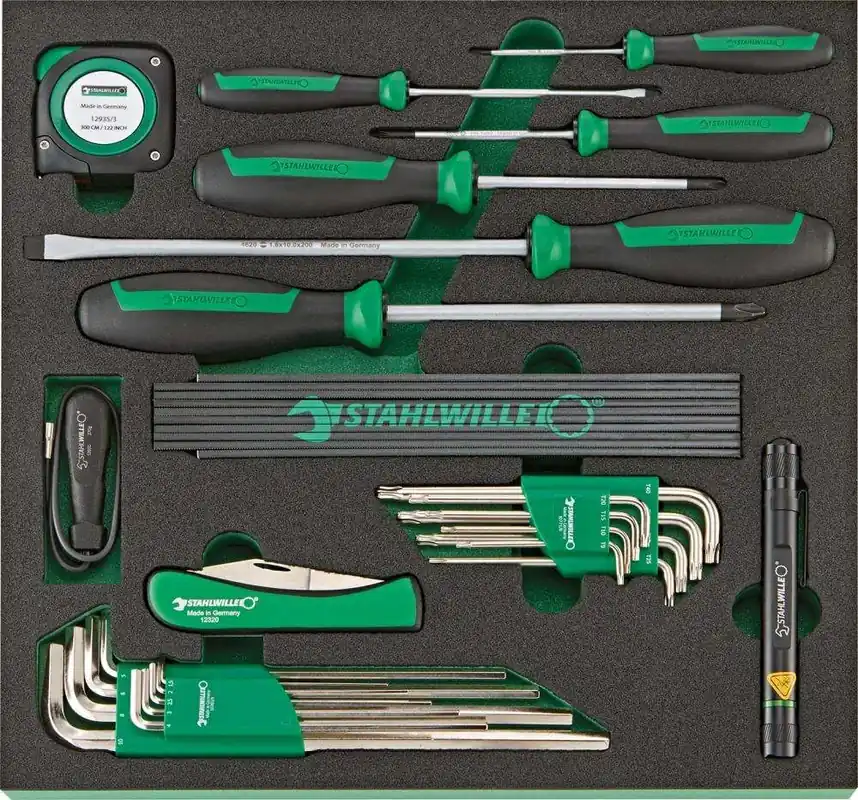 Moduł narzędziowy z wkrętakami, 27-częściowy, moduł 2/3Wykonanie: narzędzia bezpiecznie przechowywane w dwukolorowej wkładce piankowej odpornej na działanie chemikaliów i pozwalającej na szybką identyfikację brakujących narzędzi. Moduł 1/3 = 175 x 350 mm Moduł 2/3 = 350 x 350 mm 3/3+ moduł = 530 x 350 mm Zestaw narzędzi w modułowym systemie wkładek narzędziowych Tool Control System (TCS).Zestaw wkrętaków, 27-częściowy 1 wkrętak dla elektroników do śrub z rowkiem 2,5 mm 2 wkrętaki do śrub z rowkiem 4; 10 mm 3 wkrętaki do śrub z gniazdem krzyżowym PH 1; 2; 3 1 nóż do kabli 1 taśma miernicza, 3 m 1 chwytak magnetyczny, miniaturowy 270 g 1 metrówka składana drewniana 2 m 1 zestaw kluczy trzpieniowych do śrub z gniazdem TORX®, z końcówką kulistą, 8-częściowy, T 9–T 40 1 zestaw kluczy trzpieniowych do śrub z gniazdem 6-kątnym z końcówką kulistą, 9-częściowy, 1,5–10 mm