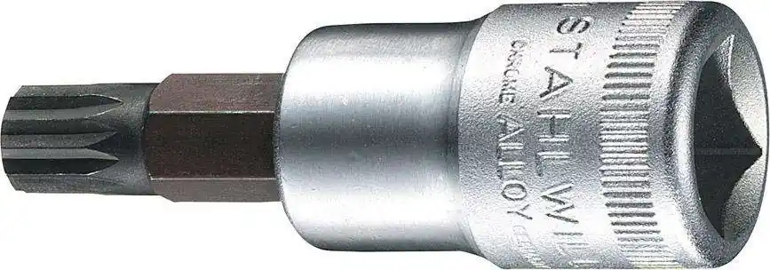 Wkrętakowa końcówka wymienna 1/2”do śrub z gniazdem wielowypustowym XZNWykonanie: DIN 2324. Ze stali chromowo-wanadowej, chromowanej. Radełkowana powierzchnia ułatwiająca chwycenie.