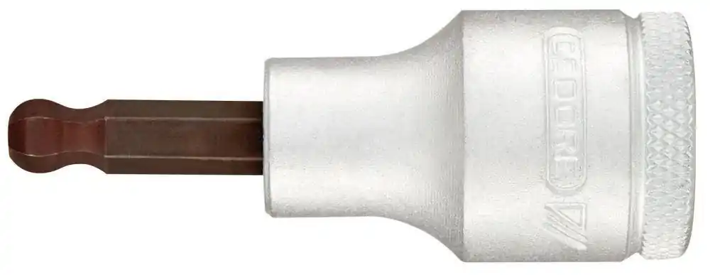 Nasadka wkrętakowa 1/2″ do śrub z łbem z gniazdem sześciokątnym, z główką kulistąWykonanie: DIN 7422, z rowkiem ustalacza kulkowego i radełkowaniem.Ze stali chromowo-wanadowej, polerowanej i chromowanej, wierzchołki ze stalichromowo-wanadowej, z powłoką TiN, która zapewnia większy moment obrotowy, odporność na korozję i minimalizuje efektCam-Out. Z główką kulistą.