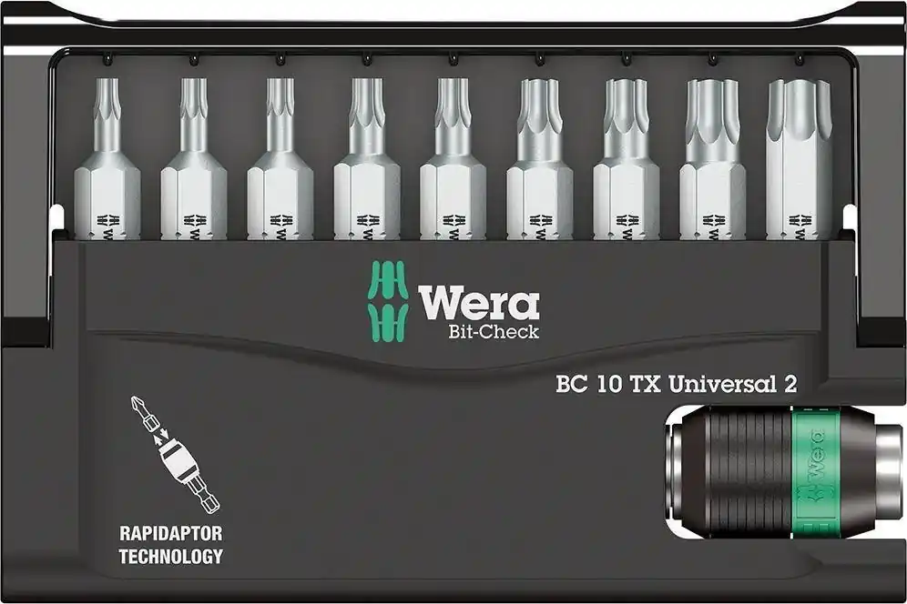 Zestaw bitów Bit-Check 10 nierdzewny 1Wykonanie: Bity ze stali szlachetnej w uchwycie z tworzywa sztucznego Bit-Check. Bity są rozmieszczone w przejrzysty sposób,dzięki czemu można je szybko wyciągnąć. Zastosowanie: Produkt specjalny, zabezpiecza przed korozją nalotową przy obróbce śrub ze staliszlachetnej.Zawartość zestawu: 1 uchwyt do bitów Rapidaptor nierdzewny 1 bit krzyżowy PH 2 3 bity krzyżowe PZ 1; 2 (2 sztuki) 5 bitów do śrub z łbem z gniazdem TORX® T 10; 15; 20; 25; 30