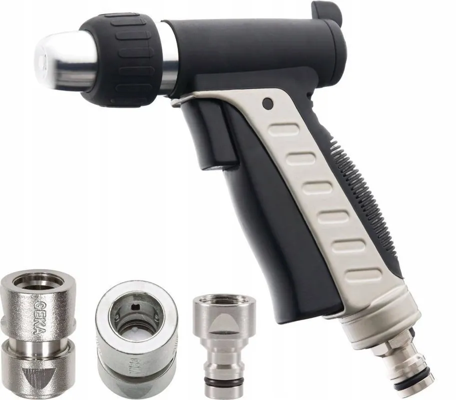 Oryginalny zestaw do nawadniania ogrodu Geka WYGODA I TRWAŁOŚĆBezstopniowo regulowane ciśnienie wody – od mocnego strumienia do delikatnej mgiełki.Pierścień na głowicy strzykawki chroni przed uszkodzeniem.Ergonomiczny uchwyt z blokadą pozwala na komfortową pracę przez dłuższy czas.Bardzo wygodny uchwyt został dostosowany do pracy jedną ręką.Zastosowany niklowany mosiądz nadaje zestawowi szczególną trwałość.Produkt jest kompatybilny ze wszystkimi popularnymi systemami wtykowymi i rodzajami węży.