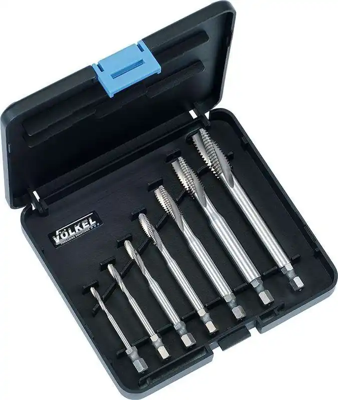 Zestaw gwintowników maszynowych HexDrive, kształt CZastosowanie: gwint metryczny ISO z otworem przelotowym. Dobrze obrabialne materiały do 900N/mm², stale niestopowe i niskostopoweKształt C ze spiralą prawoskrętną 15° do otworów nieprzelotowych (nakrój 2 do 3 zwojów).Zawartość zestawu: 7 gwintowników M3; 4; 5; 6; 8; 10; 12