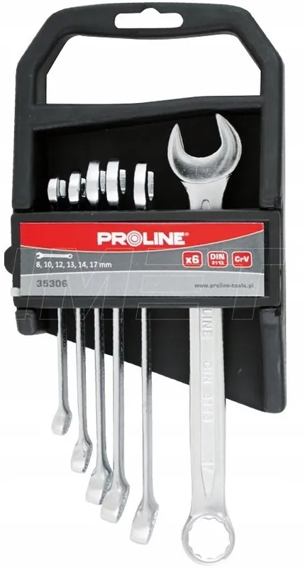 Zestaw kluczy płasko-oczkowych 8-17mm 6cz. PROLINE 35306Klucze płasko-oczkowe 8-17mm 6cz. PROLINE 35306Zestaw kluczy płasko – oczkowych wysokiej jakości, profesjonalne klucze polecane do warsztatów i serwisów mechanicznych.Kute na zimno, główki szlifowane.Materiał: stal narzędziowa chromowo – wanadowa CrV spełniająca normę DIN 3113.Chromowane – dodatkowa ochrona antykorozyjna.Główka oczkowa dwunastokątna.Zestaw w trwałym praktycznym etui z organizerem oraz opcją powieszenia na ścianie.6 szt.: 8, 10, 12, 13, 14, 17 mmMarkę PROLINE stworzyli doświadczeni eksperci, którzy od lat pracuja nad rozwojem narzędzi ręcznych.Oferowane przez nią rozwiązania są odpowiedzią na potrzeby wszystkich (zarówno profesjonalistów, jak i wymagających amatorów), którzy chcą szybko i sprawnie korzystać z narzędzi ręcznych w swoich codziennych pracach.Narzędzia PROLINE – wytrzymałe i dokładnie wykonane – projektowane są zgodnie z dewizą „dobrym narzędziem lepiej pracujesz”.Testowane są w ekstremalnych warunkach – przechodzą więc surowy proces selekcji, gwarantujący najwyższą jakość.