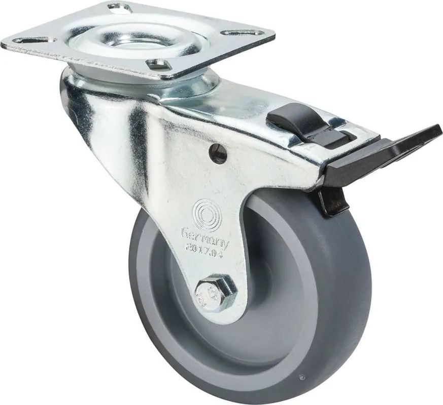 Zestaw kołowy skrętny, z blokadą całkowitą•widelec z blachy stalowej, ocynkowanej i chromowanej •dwurzędowe łożysko kulkowe w głowicy widelca •guma w kolorze szarym •korpus koła z tworzywa sztucznego •łożysko ślizgowe