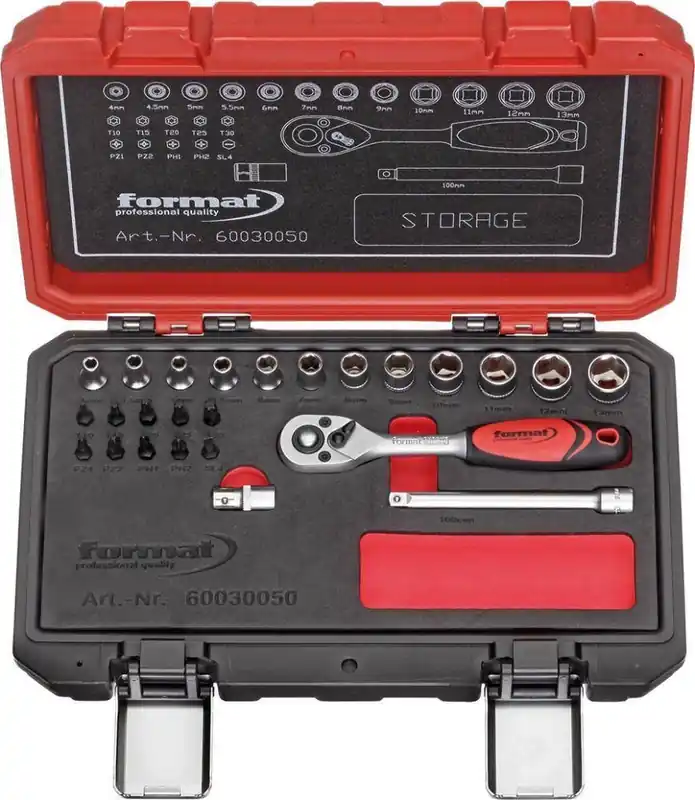 Zestaw sześciokątnych końcówek wymiennych klucza nasadowego 1/4″ , 16-cz.Wykonanie: Narzędzia ze stali chromowo-wanadowej, gniazda sześcio- i czworokątne o zaokrąglonychnarożnikach do ochrony gniazda napędowego i łba śruby. Grzechotka dwukierunkowa z przełącznikiem dźwigniowym, 72-zęby, kąt powrotu 5°. Dostawa w stabilnej, lakierowanej kasecie metalowej z uchwytem do noszenia. Narzędzia tesą umieszczone w 2-kolorowym wkładzie piankowym, gdzie miejsca po brakujących narzędziachsą dobrze widoczne. W pokrywie znajduje się jeszcze jeden wkład piankowy ze schematycznymoznaczeniem rozmieszczenia narzędzi.Zawartość zestawu: 1 grzechotka dwukierunkowa z przełącznikiem dźwigniowym 11 sześciokątnych końcówek wymiennych klucza nasadowego 4; 4,5; 5; 5,5; 6; 7; 8; 9; 10; 11; 13 mm 1 uchwyt wtykowy 1 uchwyt poprzeczny z elementem ślizgowym 1 przedłużka 105 mm 1 przegub Kardana