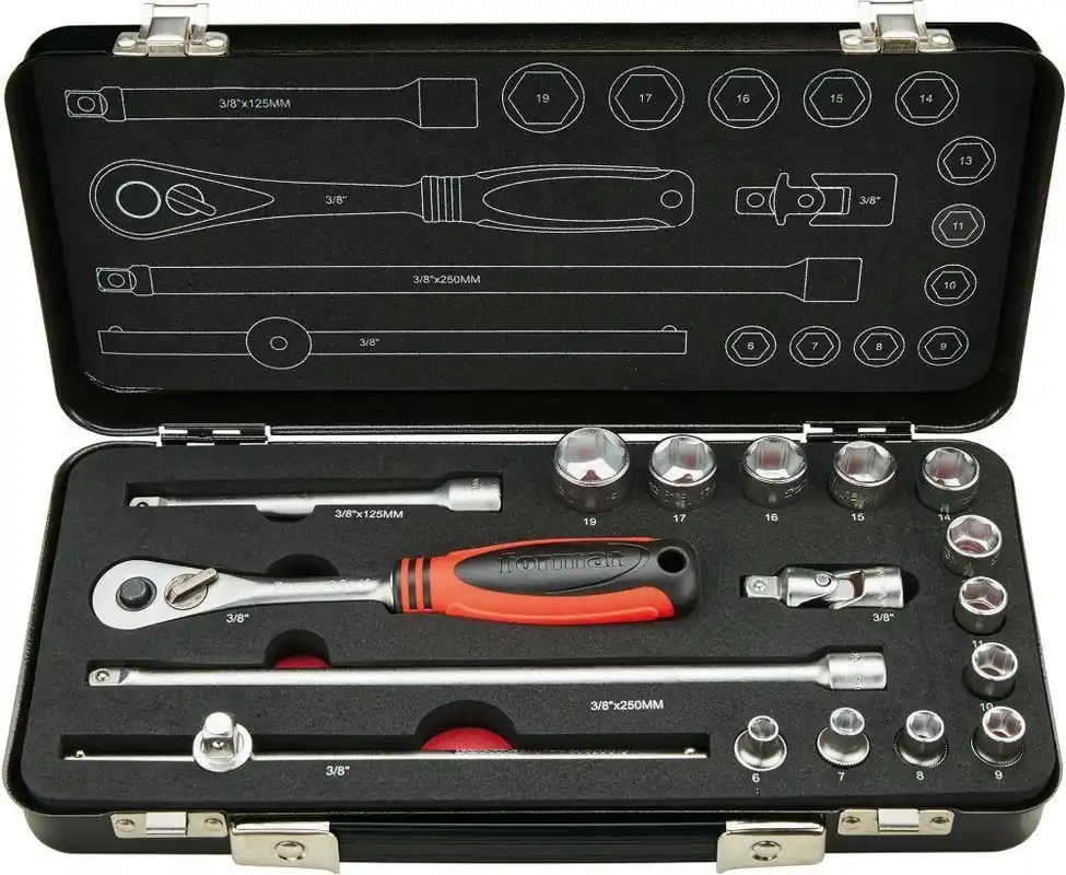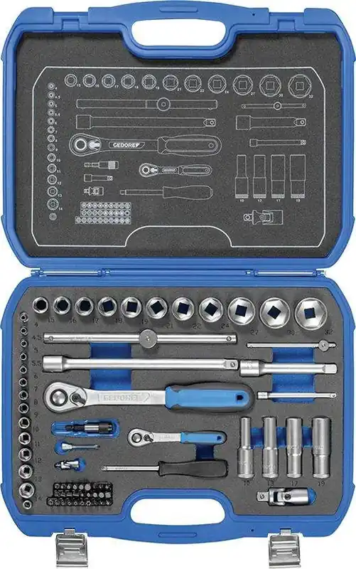 Zestaw końcówek wymiennych klucza nasadowego 12-kątnych 3/4″, 14-częściowyWykonanie: narzędzia ze stali wanadowej 31CrV3 GEDORE, kute, szlifowane i chromowane. Dostawa w kasecie z blachy stalowej GEDORIT.