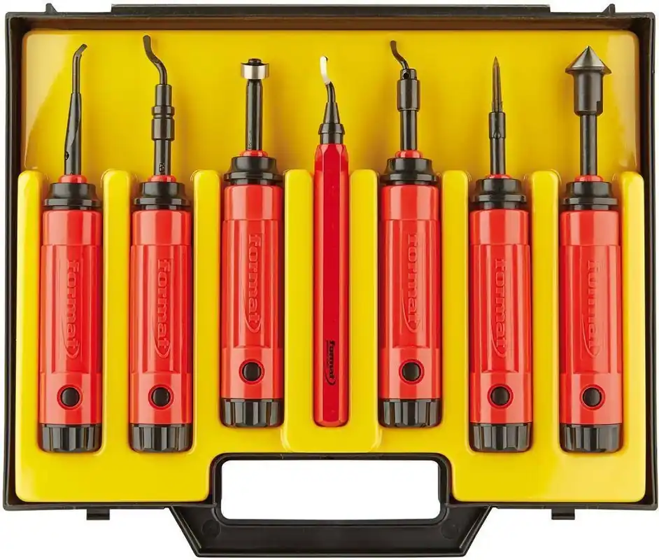 Uniwersalny gratownik el 1300 niemieckiej firmy formatZestaw składa się z: 1 szt. uniwersalny uchwyt z tworzywa sztucznego EL 1000 FT z magazynem ostrzy 1 szt. uchwyt ostrzy EL 0300 FT – Do wszystkich pogłębiaczy typu C 1 szt. głowica do pogłębiania HSS C20 Przeznaczenie: Stabilne, uniwersalne narzędzie do gratowania otworów o średnicach powyżej 4 mm. Do głowic do pogłębiania HSS do Ø 30 mm.Stal wysokowydajna szybkotnącaOstrza wymienneZastosowanie: Stabilne, uniwersalne narzędzie do gratowania otworów o średnicach powyżej 4 mm. Do głowic do pogłębiania HSS do Ø 30 mmUchwyty ostrzy EL 1000 FT i EL 0300 FT
