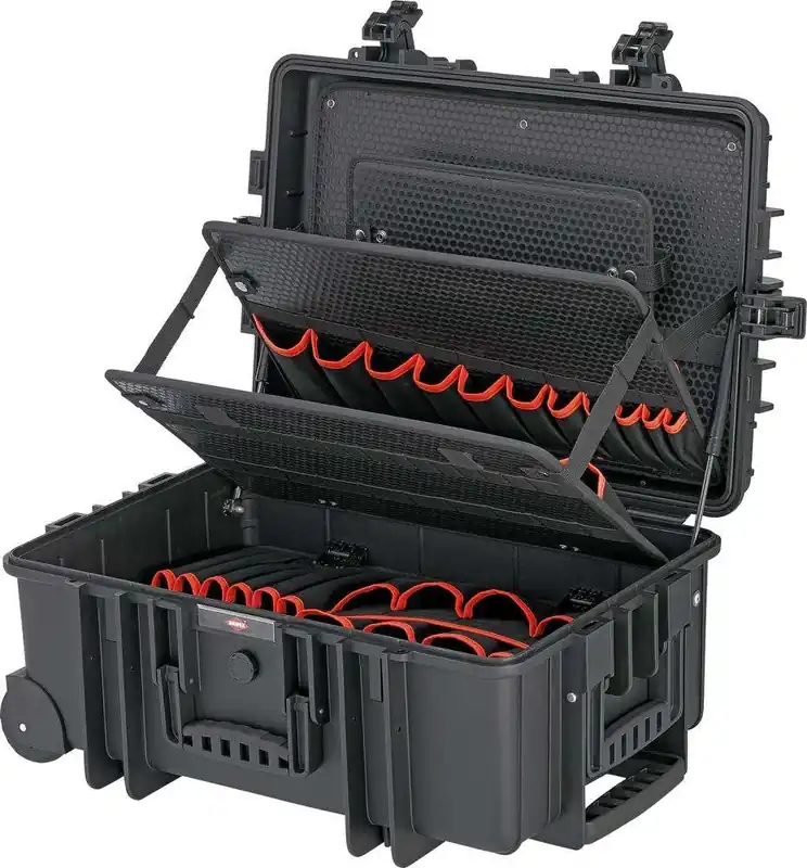 Walizka narzędziowa Robust45 MoveWykonanie: z odpornego polipropylenu koloru czarnego, odporna na pękanie i uderzenia, pyło- i wodoszczelna oraz odporna na działanie temperatury w zakresie od -30 °C do +80 °C. Zamykana hermetycznie, z zaworem wyrównującym ciśnienie. Z wytrzymałymi tablicami narzędziowymi i stabilnym, gumowanym uchwytem do przenoszenia, blokowanym, ergonomicznym uchwytem teleskopowym i lekko obracającymi się kółkami. Wysokość części spodniej 236 mm. Łatwe otwieranie i zamykanie dzięki sprężynom gazowym. Wytrzymałość obciążeniowa walizki do 35 kg. Bardzo stabilna, z możliwością układania w stosy i wytrzymała. Zamykana na dwa zamki z mechanizmem zatrzaskowym i kłódki (nie wchodzą w zakres dostawy). Walizka przystosowana do przewozu samolotem. Wyposażenie: 147 przegródek kieszonkowych na tablicy narzędziowej