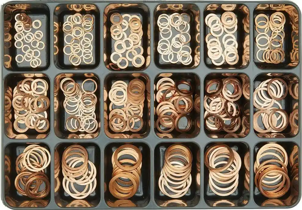 Pierścienie uszczelniające, miedziane, DIN 7603, kształt AZestaw nr 19 •335-częściowy zestaw pierścieni uszczelniających, miedzianych, DIN 7603, w wytrzymałej kasecie stalowej Wymiar nominalny: Grubość 1,0 mm: 6 x 108 x 128 x 1410 x 1410 x 16 Grubość 1,5 mm: 12 x 1612 x 1814 x 1814 x 2016 x 22 18 x 2420 x 2622 x 27 Grubość 2,0 mm: 24 x 3024 x 3226 x 3228 x 3430 x 36