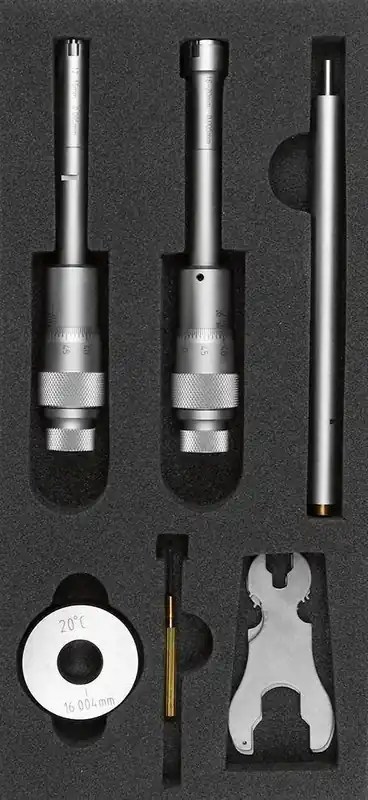 Zestaw średnicówek mikrometrycznychWykonanie: dostawa z pierścieniami nastawczymi i wkrętakiem, w kasecie z tworzywa sztucznego.Zawartość zestawu: 1 x średnicówka mikrometryczna 3-punktowa 12–16 mm 1 x średnicówka mikrometryczna 3-punktowa 16–20 mm 1 pierścień nastawczy o średnicy 16 mm 1 x przedłużka