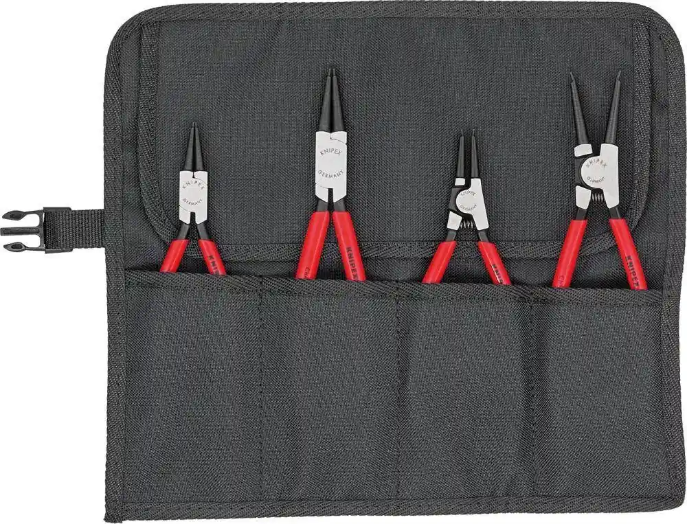 Zestawy szczypiec do pierścieni osadczychWykonanie: DIN 5254 A i 5256 C (proste) oraz DIN 5254 B i 5256 D (wygięte). Ze stali chromowo-wanadowej, odkuwane, hartowane w oleju i odpuszczane, główka polerowana. Bezpoślizgowe dzięki specjalnemu kształtowi wierzchołków. Rękojeści powlekane tworzywemsztucznym. Dostawa w nylonowym, zwijanym etui.Zawartość zestawu: po 1 do pierścieni wewnętrznych J1 i J2 po 1 do pierścieni zewnętrznych A1 i A2