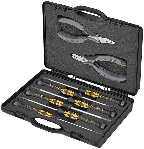 Zestaw szczypiec miniaturowychDostawa w etui z poliestru do zawieszenia na pasku, z zapięciem na rzep i uchwytami pętelkowymi do zawieszania.Rękojeści powlekane tworzywem sztucznym.Zawartość zestawu: 1 szczypce nastawne do rur Cobra® 125 mm 1 szczypce-klucz 150 mm