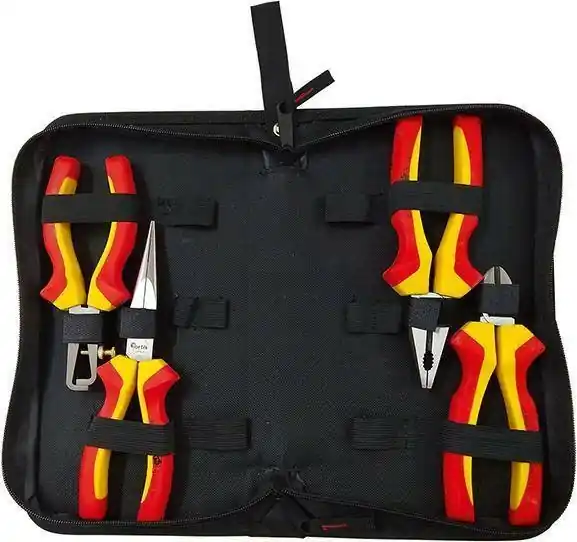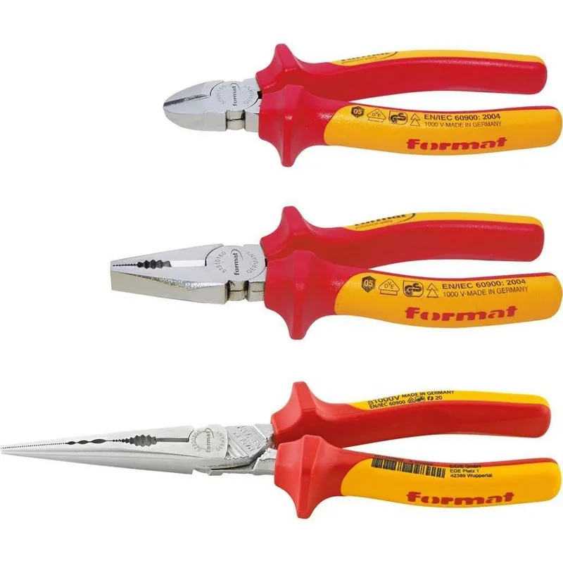 Zestaw szczypiec VDE•główka polerowana •rękojeści z wielokomponentowymi nakładkami z tworzywa sztucznego • izolowane do 1000 V, zgodnie z IEC 60900, DIN EN 60900 i VDE 0682 część 201 Wysyłka:w nylonowym etui. Zawartość: Szczypce uniwersalne VDE, 180 mm, Szczypce tnące wydłużone typu ” bociani dziób” VDE, 200 mm , Szczypce tnące boczne VDE, 160 mm, Szczypce do ściągania izolacji VDE, 160 mm