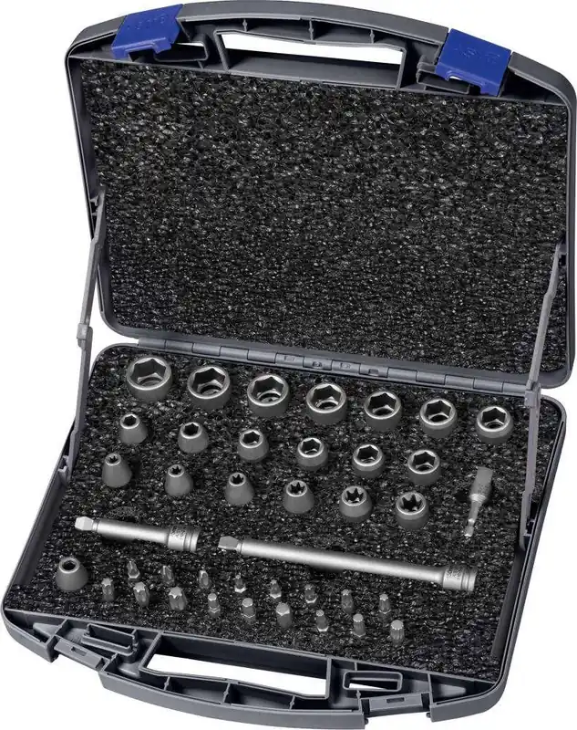 Zestaw udarowych końcówek wymiennych klucza nasadowego 1/2″ do śrub z łbem TORX®Wykonanie: z ulepszanej specjalnej stali narzędziowej, hartowanej i piaskowanej. Dostawa w pudełku z tworzywa sztucznego.