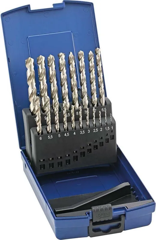 Zestaw wierteł krętych, z chwytem cylindrycznymWykonanie: profil szlifowany, prawotnące, z precyzyjnym zaszlifowaniem krzyżowym, bocznym kątem natarcia, grubość izbieżność rdzenia normalne. Dostarczane w wytrzymałej kasecie, z wysokiej jakości tworzywasztucznego z funkcją automatycznego wysuwania wierteł przy otwarciu. Zastosowanie: zwiększona zawartość kobaltu zapewnia wyższą wytrzymałość cieplną. Przeznaczone w szczególności do stali stopowych i niestopowych (maks. wytrzymałość 900N/mm²), stali do pracy na zimno i na gorąco, do ulepszania cieplnego i nawęglania oraz dostali nierdzewnych i kwasoodpornych.