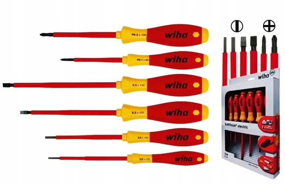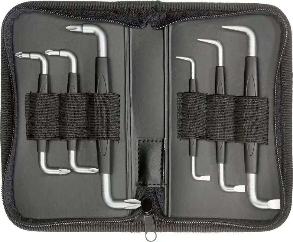Zestaw wkrętaków dwustronnych, odgiętych, kątowych, do śrub z rowkiem i gniazdem krzyżowym•ze stali chromowo-wanadowej •chrom satynowy •końcówki wygięte 90° i 180° Zawartość: 3 wkrętaki dwustronne, odgięte, kątowe do śrub z rowkiem 4; 5,5; 8 mm 2 wkrętaki dwustronne, odgięte, kątowe do śrub z gniazdem krzyżowym PH 1 / PH 2; PH 2 / PH 3 1 wkrętak dwustronny, odgięty, kątowy do śrub z gniazdem krzyżowym PZ 1 / PZ 2
