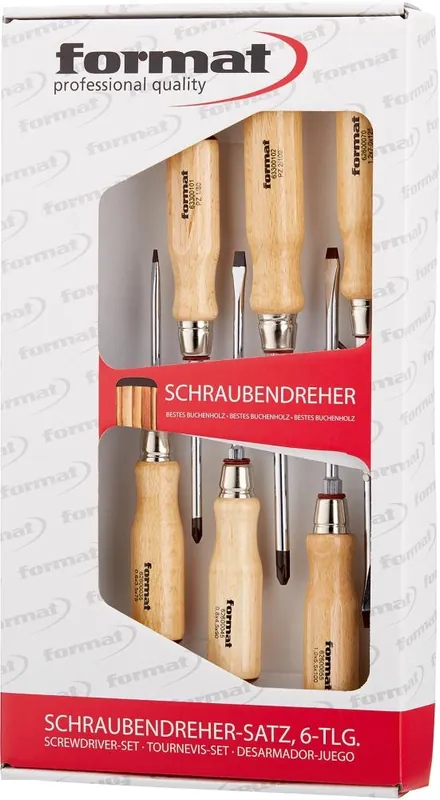 solidny zestaw wkrętaków śrubokrętów z drewnianą rękojeścią frimy formatZestaw wkrętaków FORMAT z rękojeścią drewnianą, 6 częściWykonanie: Z wysokostopowej stali specjalnej. Ciągły trzon o profilu okrągłym z sześciokątnym zabierakiem do zwiększenia siły kluczami szczękowymi lub oczkowymi i specjalną powłoką dla zwiększenia momentu obrotowego oraz dokładności pasowania. Rękojeść z twardego drewna jesionowego z podwójną skórzaną nakładką chroniącą przed drzazgami podczas uderzeń młotkiem.Zawartość zestawu: 4 wkrętaki płaskie (nr zamów. 6260) 3,5 x 90; 4,5 x 90; 5,5 x 100; 7 x 125 mm 2 wkrętaki krzyżowe (nr zamów. 6292) PZ 1; 2Stal specjalna wysokostopowaRękojeści z twardego drewna jesionowego z podwójną skórzaną nakładką chroniącą przed drzazgami podczas uderzeń młotkiem.Trzpień sześciokątnyKońcówka wkrętaka grot do wkrętów z gniazdem krzyżowym PZ oraz płaskim