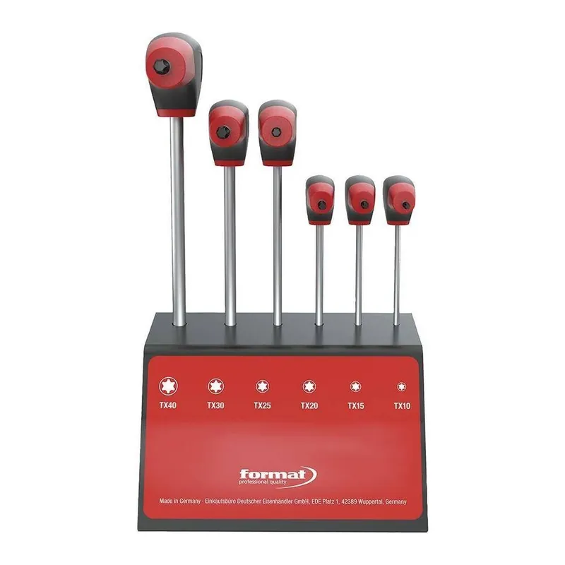 Zestaw wkrętaków z uchwytem poprzecznym do śrub TORX®Wykonanie: ze stali chromowo-wanadowej, chromowanej, z czarną końcówką. Ciągłe ostrze do przenoszenia wysokich momentów obrotowych. Rękojeść z wieloskładnikowego tworzywa sztucznego, ergonomicznie uformowana z otworem do powieszenia. Główka wkrętaka z oznaczeniem profilu i rozmiaru. dostawa w stojaku warsztatowym.