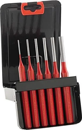 Zestaw wybijaków zawleczek z tulejką prowadzącąWykonanie: stal chromowo-wanadowa, ocynkowana i chromianowana. Trzon wąski, radełkowany; kieł hartowany; przesuwana tulejka prowadząca, hartowana i kodowana (w przypadku Ø 5,9 mm ze stałą tulejką prowadzącą).Dostawa w kasecie metalowej. Zastosowanie: Wierzchołek kła jest nasadzany poprzez przesuwaną do przodu tuleję prowadzącą. W trakcie wybijania kieł wybijaka podpierany jest przez ruchomą tulejkę, co zapobiega w dużym stopniu złamaniu kła podczas pracy.