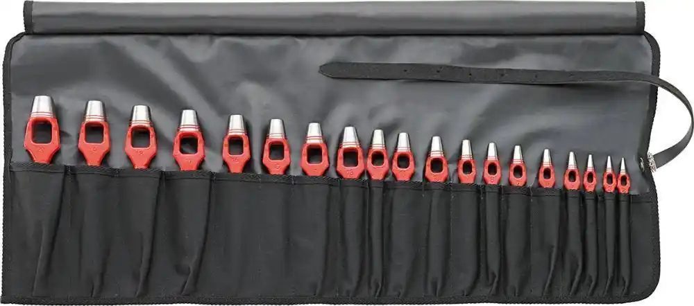 Zestaw wykrojników ręcznych z uchemWykonanie: DIN 7200 A, ze specjalnej stali narzędziowej, odkuwany matrycowo z precyzyjniepolerowanym ostrzem i uchwytem powlekanym proszkowo. Ostrze hartowane i odpuszczone,wewnątrz lekko stożkowe, do łatwego usuwania wykrojonego materiału. Dostawa w zwijanejtorbie. Zastosowanie: do dziurkowania skóry, gumy, filcu, pianki itp.Zawatość zestawu: 2; 4; 6; 8; 10; 12; 14; 16; 18; 20; 22; 24; 26; 28; 30 mm