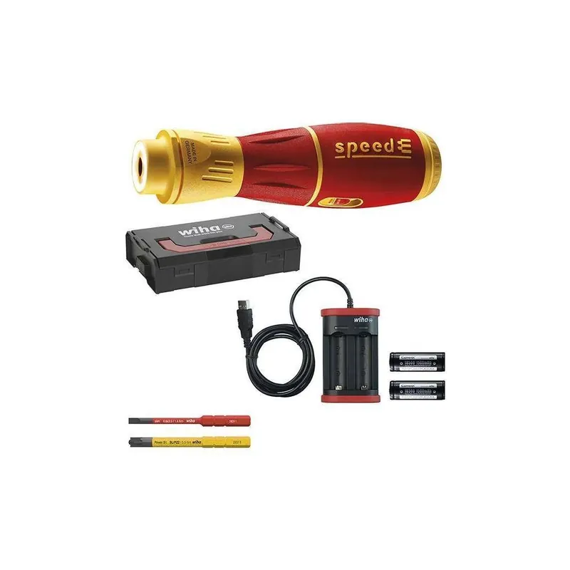 Zestaw z wkrętakiem VDE-E speedE Set I®, 4-częściowyWykonanie: dzięki kształtowi rękojeści SoftFinish® i funkcji elektrycznej grzechotki wkrętak speedE® wyraźnie zmniejsza obciążenie (zalecane przez lekarzy i terapeutów). Ze zintegrowaną latarką LED. Izolowany do 1000 V AC i 1500 V DC, według IEC 60900. Zastosowanie: do wszystkich prac związanych z wykonywaniem połączeń śrubowych, konserwacją i naprawą urządzeń silnikowych, instalacji grzewczych, klimatyzacyjnych i sanitarnych i wielu innych. Uwaga: elektroniczna grzechotka zapewnia co najmniej 3 razy szybszą pracę niż zwykłe wkrętaki, bez zmiany chwytu. Po osiągnięciu wartości 0,4 N•m elektryczne wspomaganie wyłączane jest automatycznie, co zabezpiecza obrabiany materiał, końcowe dokręcenie wykonywane jest ręcznie.