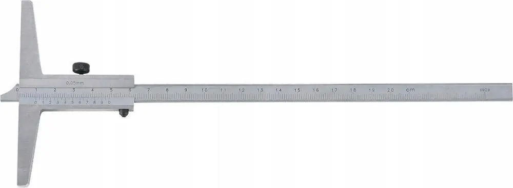 Głębokościomierz hakowy, z odsadzonym prętem pomiarowymWykonanie: ze stali nierdzewnej, hartowanej, noniusz chromowany matowo i obustronnie bardzodokładnie wyskalowany laserowo, dwustronna podziałka szyny pomiarowej, dzięki temu możebyć użytkowany jako normalny głębokościomierz, ze śrubą ustalającą. Dostawa w kasecie ztworzywa sztucznego.