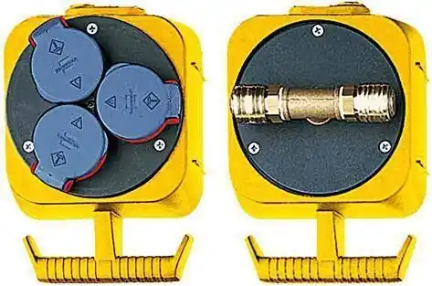 Kostka zasilająca podwieszanaWykonanie: Bardzo wytrzymały model ze specjalnego tworzywa sztucznego odpornego na uderzenia, z 3 gniazdami wtykowymi CEE, zabezpieczenie przed wodą rozpryskową, samozamykające się pokrywy oraz przyłącze sprężonego powietrza z 2 złączkami pneumatycznymi obsługiwanymi jedną ręką. Wąż do sprężonego powietrza 5 m Ø6/12 mm. Różne możliwości przyłączania. Rozdzielacz może być podwieszony bezpośrednio nadmiejscem pracy dzięki stalowemu łańcuchowi o długości 3 m i w każdej chwili może byćopuszczony na odpowiednią wysokość. Zastosowanie: Do stosowania w pomieszczeniach oraz do krótkotrwałego stosowania na zewnątrz.