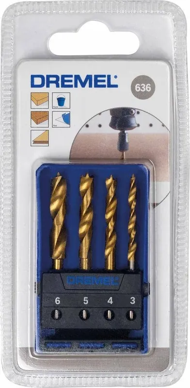 DREMEL 636 ZESTAW WIERTEŁ DO DREWNA 3,4,5 i 6mm – 4 SZTUKIPozycjonowanieZestaw 4 wierteł do wiercenia w drewnieKorzyści dla użytkownikaDo czego służy narzędzie robocze?Zestaw wierteł do drewna Dremel zawiera 4 wiertła z punktem centrującym. Idealne do precyzyjnego wiercenia w twardym i miękkim drewnie, laminatach, sklejce, płytach wiórowych i pilśniowych. Powłoka tytanowa zapewnia wysoką wydajność i dłuższą żywotność. Średnice wierteł znajdujących się w zestawie to 3, 4, 5 i 6 mm.Korzyści dla użytkownikaZestaw 4 wierteł z ostrzem centrującym do wiercenia w drewnie.Długi okres użytkowania dzięki powłoce tytanowej.Idealne do precyzyjnego wiercenia w twardym i miękkim drewnie, laminatach, sklejce i wielu innych materiałach.Średnice: 3 mm, 4 mm, 5 mm i 6 mm.