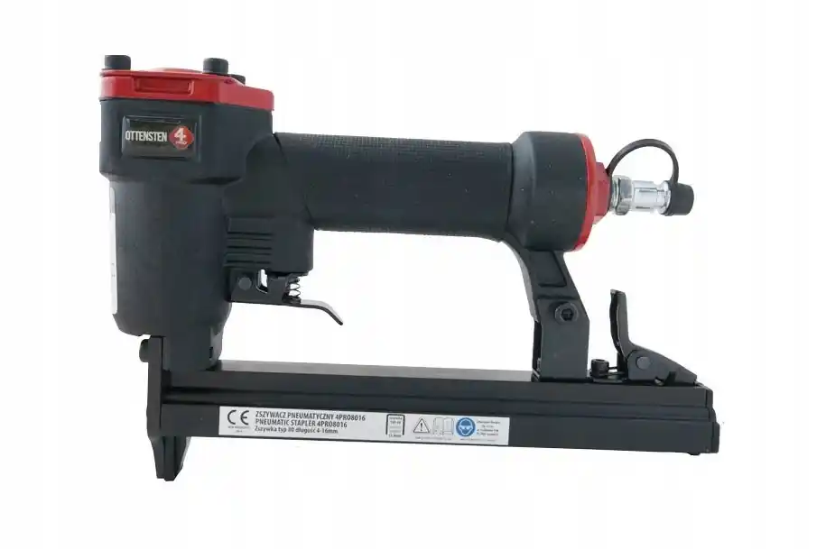 ZSZYWACZ PNEUMATYCZNY TAPICERSKIOTTENSTEN 4PRO8016 16mmZszywacz tapicerski pneumatyczny 4PRO8016 na zszywkę 80 o długości 4mm-16mmZALETY:niewielki ciężar narzędziaciśnieniowo odlewany aluminiowy korpus gwarantuje siłę wbijaniamagazynek wykonany ze stopu aluminiumszybko zwalniający zamek magazynku – usprawnia ładowanie zszywek18 mm nosek i wydłużona płyta czołowa ułatwiają wbijanie łączników w trudno dostępnych miejscachniskie zużycie powietrza i cicha pracarękojeść antypoślizgowa,zabezpieczenie spustu.ZASTOSOWANIE:przy produkcji mebli tapicerowanych,przybijanie ścian tylnych,metkowanie drewnianych elementów,prace wykończeniowe,montowaniu pokryw przeciwkurzowych,produkcji mebli ratanowych,scalanie ram obrazów lub luster.w zakładach szewskich; dekoratorniach; zakładach produkujących: ozdoby drewniane, skórzane, zabawkiprzy tworzeniu scenografii telewizyjnych i teatralnychw gospodarstwach domowych.Dane techniczne:ciśnienie pracy 70 – 110 PSI (5-7,5 BAR)maksymalne ciśnienie 120 PSI (8,3bar)użycie powietrza 0,11L/wystrzałpojemność magazynka 100 szt.długość zszywki 4-16 mmwlot powietrza 1/4″ N.P.Tmasa 1,3 kg wymiary 55x240x248 mmtyp zszywki 80poziom wibracji 2,4 m/s2poziom hałasu 83,5 Db(A)