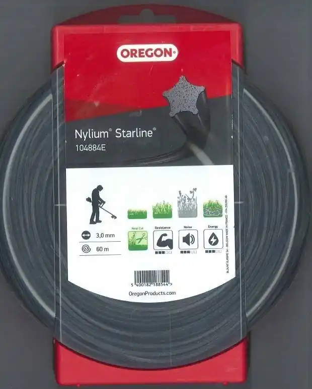 OREGON® Nylium Starline to jedyna na rynku żyłka tnąca wykonana z materiału wzmocnionego cząsteczkami aluminium. Wyjątkowe połączenie kopolimerów i aluminium nadaje jej wysoką odporność na ścieranie, łamanie przy oczku oraz topnienie i sklejanie w głowicy. Jej gwiazdkowy profil zapewnia szybkie, równe i profesjonalne koszenie zawsze ostrą krawędzią żyłki, redukując jednocześnie poziom drgań silnika.Żyłka do kos OREGON Nylium Starline polecana jest do przydomowych, jak i profesjonalnych zastosowań. Wszędzie tam, gdzie potrzebna jest mocna i wydajna żyłka tnąca. W szczególności do wykaszania dzikich zarośli lub/i na wilgotnych terenach, gdzie wzrost roślin jest bardziej intensywny, a ich łodygi mocniejsze.Żyłki tnące o profilu gwiazdkowym dzięki ostrym krawędziom odznaczają się agresywniejszym koszeniem w porównaniu z żyłkami okrągłymi, dlatego nie zaleca się ich do koszenia młodych i słabo ukorzenionych trawników.Parametry techniczneDługość: 90mPrzekrój: gwiazdkaŚrednica: 2,4mmOpakowanie: zwitekZastosowanie: chaszcze, chwastyŻyłka do kos OREGON Nylium Starline wyróżnia się spośród produktów innych marek:Wyjątkową wytrzymałością uzyskaną dzięki cząsteczkom aluminium.Bardzo wysoką odpornością na łamanie przy oczku.Zwiększoną odpornością na strzępienie i ścieranie.Wysoką temperaturą topnienia zabezpieczającą ją przed sklejaniem.Szybszym, równym i dokładnym koszeniem jaki zapewnia gwiazdkowy profil.Przeznaczenie żyłki tnącej OREGON Nylium Starline:Wykaszanie trawników o średnim i dużym poziomie zachwaszczenia.Wykaszanie wysokich traw i średniej wielkości zarośli.Wykaszanie roślin o twardych łodygach.Koszenie w warunkach zwiększających ryzyko zerwania żyłki.Koszenie w wysokich temperaturach pracy.